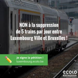 Il n’est pas trop tard pour que la SNCB fasse machine arrière! Les travaux bien nécessaires ne peuvent être un prétexte à ces suppressions. Faisons pression sur le Ministre MR de la Mobilité, François Bellot, pour que la SNCB maintienne son offre ferroviaire entre Luxembourg ville et Bruxelles.